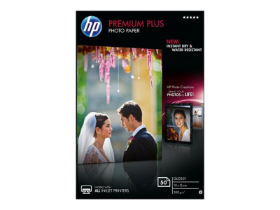 HP Premium Plus Photo Paper - Brillant - 100 x 150 mm - 300 g/m² - 50 feuille(s) papier photo - pour ENVY 50XX, 7645; Officejet 52XX; PageWide MFP 377; Photosmart B110, Wireless B110