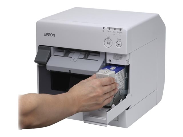 L'Epson TM-C3400BK est une imprimante d'étiquettes à jet d'encre haute performance permettant d'imprimer des codes-barres, des fiches d'identification, des étiquettes. L'imprimante TM-C3400BK a été conçue pour être peu encombrante, mais également pour pouvoir s'installer sur un comptoir ou sous un bureau. À cet effet, tous les éléments fonctionnels, y compris la cartouche d'encre haute capacité et les rouleaux de papier, sont accessibles et remplaçables depuis l'avant de l'appareil.
